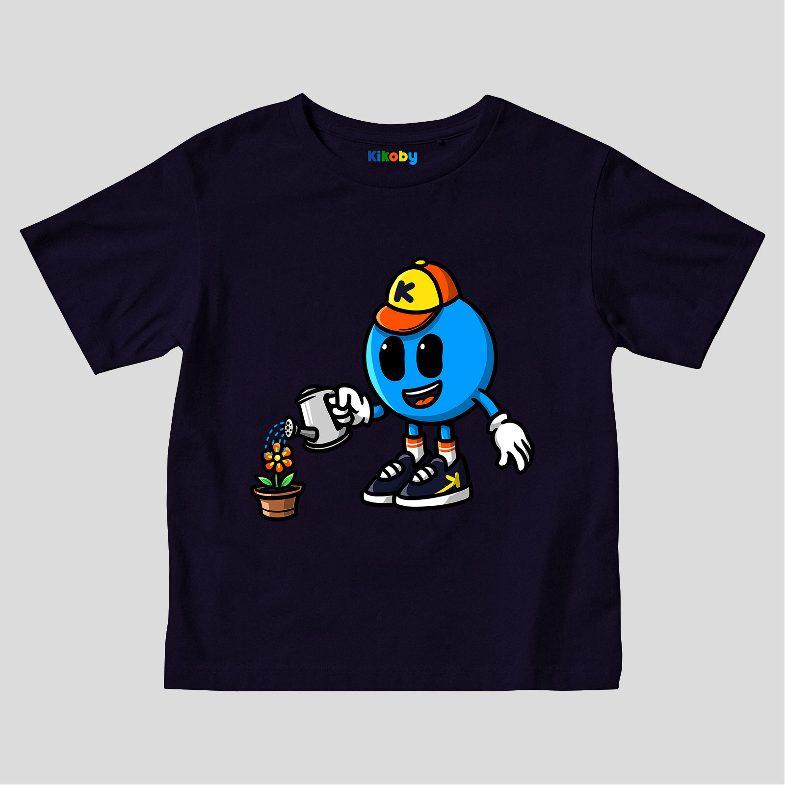 - T-shirt enfant manches courtes imprimé Kikoby découvre le jardin.